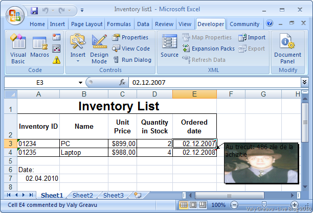 Range("E3").Comment.Text Text:="Au trecut: " & Res1 & " zile de la achizitie"