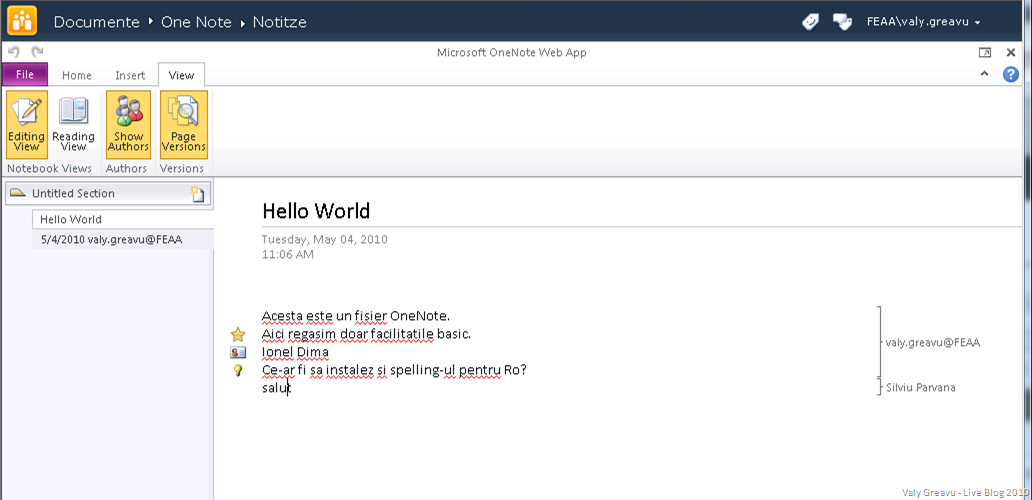 OneNote OnLine 2010  La fel ca la Excel se poate lucra în mod simultan pe același fișier.