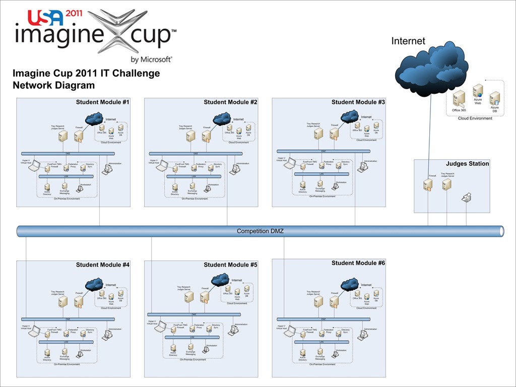 În IT Challenge studenții trebuie să configureze o infrastructură de rețea pentru o companie care dorește să păstreze anumite servicii on-premise și altele on-cloud și în același timp să asigure și coexistența lor. Ei au la dispoziție un domeniu preconfigurat în Office 365 și unul în Azure, urmând să solicite înregistrările de DNS de la ISP (DNS-ul de la Judge), să configureze TMG în așa fel încât să permită sincronizarea dintre Active Directory intern și Office 365, să instaleze Exchange și SharePoint intern și o soluție de tip antivirus. Povestea e lungă de cam 10 pagini… și rezolvabilă.