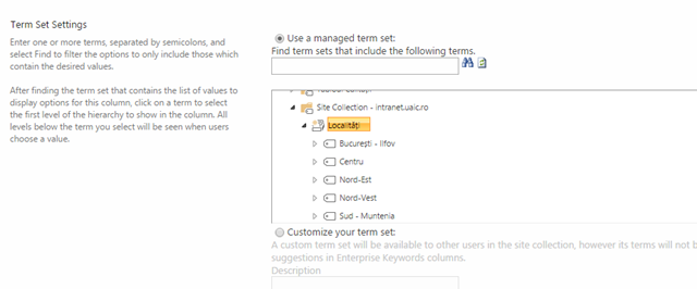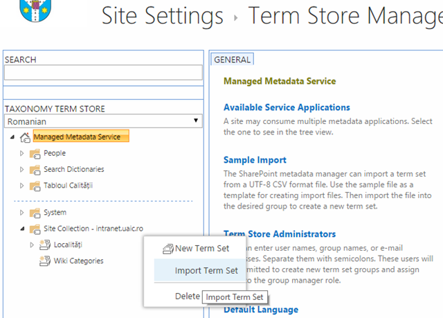 - Săgeata în jos din dreptul Site Collection – Numele site-ului vostru, Import Term Set