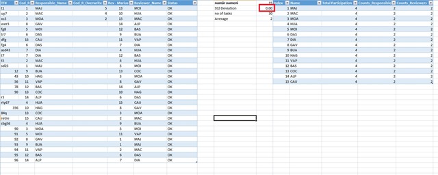 Asta înseamnă că dacă un angajat a primit deja un task, ar trebui să alocăm altora care nu au primit deja, și care nu au același ID cu cel al resposabilului. Numărul de review-uri alocate este specificat în tabelul de Angajați sub forma unui countif din tabelul de task-uri.