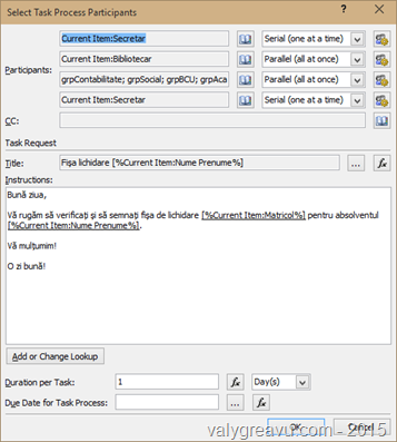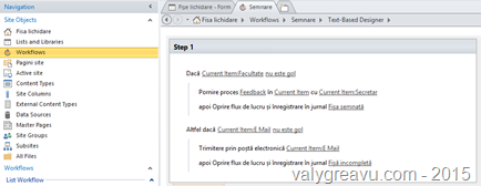 Pseudocod flux generat în SharePoint Designer și particularizat după specificul activității și rolurilor definite.