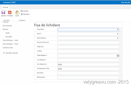 Exclud din start varianta de a completa un template și trimiterea lui la o anumită adresă de e-mail. Se vehiculează în Universitate o formă de admitere on-line în Excel, dar pe moment prefer să nu comentez mai mult. Pentru cei care au cunoștințe mai avansate de SharePoint, nu mă refer aici la funcția de Incoming email din SharePoint configurată pe biblioteci de documente, care ar permite salvarea fișierelor atașate în acea librărie, pentru că: (1) utilizatorii externi vor ignora constant convențiile de notare ale numelor fișierelor și (2) va fi destul de greu să-i informezi despre progresul sau măcar finalitatea fluxului de semnare a documentului. (3) Nu exclud nici varianta în care unii dintre ei vor trimite mai multe emailuri pentru că nu au un feedback din sistem și nici cea în care unii nu au instalat pe calculator aplicații dedicate, gen Excel sau Word, sau nu știu să completeze într-un document Word care are câmpuri.