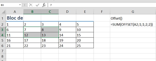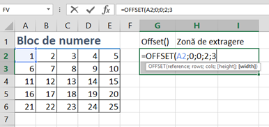 =SUM(OFFSET(A2;1;1;2;2)) vom obține rezultatul 40 pentru că se face referire la blocul de celule B3:C4.