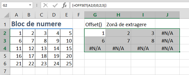 Dacă vom selecta o singură celulă sau un bloc de celule mai mic decât perimetrul 2×3 vom obține valori corespondente doar pentru blocul selectat. Dacă selectăm un număr mai mare de căsuțe decât blocul destinație vom obține în celulele din afara perimetrului 2×3 eroarea #N/A.