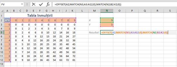 Un exemplu mai simplu față de cel prezentat: dacă din tabelul cu tabla înmulțirii dorim să extragem valoarea calculată de la intersecția liniilor cu coloanelor, folosind o zonă distinctă de introducere a datelor, va trebui să folosim două formule MATCH() pentru parametrii rows și cols.