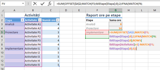 Provocarea este de a identifica numărul de linii de activități pentru fiecare etapă. Ele pot varia și în acest context nu avem cum să specificăm concret înălțimea blocului de cellule de pe care se realizează suma. De asemenea, trebuie să identificăm exact dacă o etapă este ultima sau nu, formula de calcul fiind diferită pentru etapele intermediare față de ultima etapă din raport.