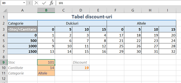 În exemplul de mai jos avem un tabel de discount-uri determinat pe stocul existent de produse precum și pe cantitatea solicitată prin comandă. Valorile sunt defalcate pe fiecare categorie de produs. Valorile de discount sunt pur orientative dar au în vedere că pentru stocuri mai mari acordăm discount-uri mai mari. De asemenea, pentru cantități comandate mai mari avem discount-uri crescute.