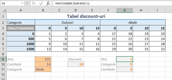 G9: =MATCH($B$9; $A$4:$A$7; 1) – determină numărul liniei din tabelul de date în care se încadrează stocul. Valoarea 101 va oferi rezultatul 1 pentru că este echivalent linei 1 din tabel, parametrul 1 din MATCH() semnificând valoare mai mică decât valoarea de pe linie.