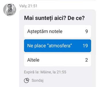 Este ora 21:58 și corectez lucrări ale studenților de anul I. Ca să fie un pic mai ca în realitate am făcut un grup de chat pe Skype cu studenții care au vrut să participe, pentru a discuta subiectele și de ce anumite note sunt așa cum sunt. Ce fac cei care nu au ajuns la examen, de ce unii au dat „rateu”… și de ce unii au făcut aproape perfect. În imagine un Pool în timp real cu de ce sunt aici. Scriind rezultatele s-au mai schimbat.