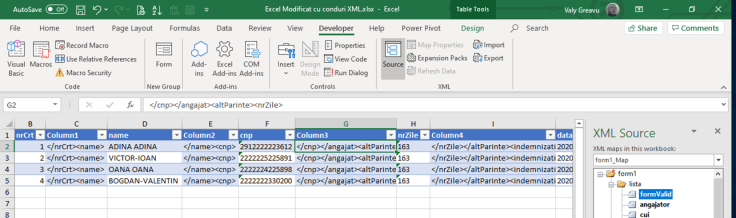 De obicei povestea aceasta se întâlnește în cazul formularelor pe care le primim din partea statului, care vin în format PDF cu conținut exportabil în XML. Acest fișier XML poate fi încărcat în Excel și vedem și în felul acesta avem și schema XML. În felul acesta putem automatiza ca să putem completa mai multe formulare simultan din Excel cu export apoi în XML. Problema apare din cauza faptului că aceste formulare care conțin linii multiple nu pot fi exportate.