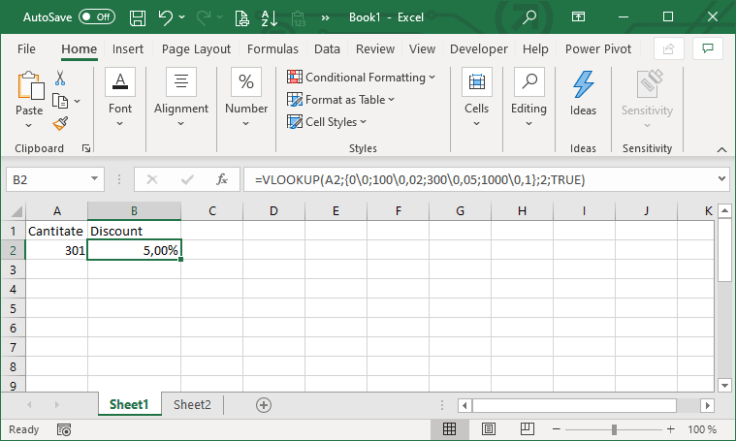 Varianta pentru Excel locale engleză: =VLOOKUP(A2,{0,0;100,0.02;300,0.05;1000,0.1},2,TRUE)