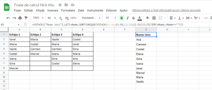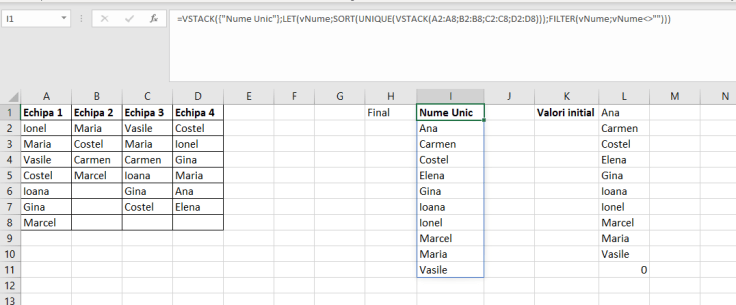 • LET(vNume;SORT(UNIQUE(VSTACK(A2:A8;B2:B8;C2:C8;D2:D8))); – Îl folosesc pentru definirea variabilei vZero ca rezultat al unicității de VSTACK. Variabila o folosesc ulterior în partea de filtrare pentru eliminarea valorilor zero.