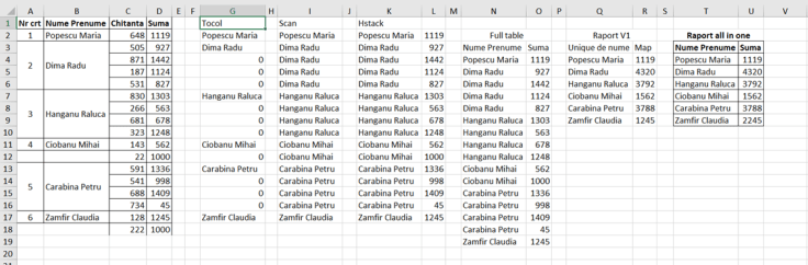 În imagine este prezentat tabelul original, coloanele A:D și raportul final în coloanele T:U.