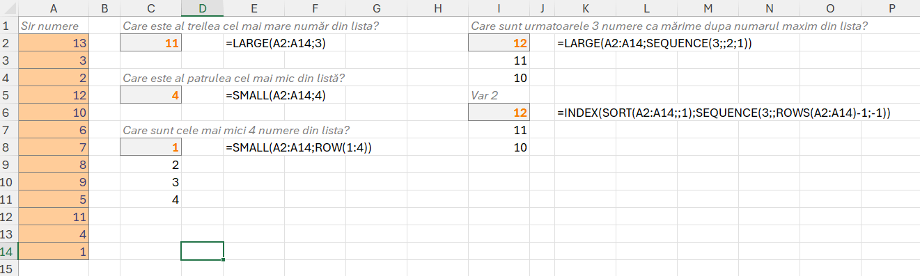 În Excel, în versiunea clasică există doar operațiuni pentru sortare, avantajul major al Excelului modern (365) este faptul că transformă multe operațiuni în funcții. De exemplu avem funcția SORT() sau SORTBY() utilizate pentru sortarea vectorilor. De asemenea, foarte utile sunt funcțiile: UNIQUE() pentru determinarea valorilor unice dintr-un interval precum și funcțiile LARGE() prin intermediul căreia putem identifica cele mai mari n valori dintr-un vector sau funcția SMALL() care ne permite identificarea celor mai mici n valori dintr-un vector.