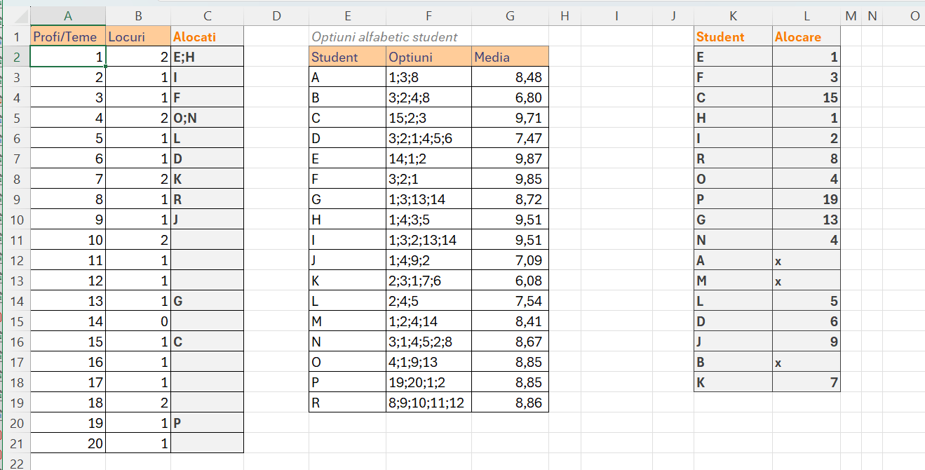 - optiuni sunt numele studenților cu opțiunile lor și media. Există și posibilitatea de a aborda alocarea și în funcție de principiul primul venit primul servit. În acest caz, dacă ordinea este cea prezentată în foaia de calcul, trebuie să modificăm valorile de pe coloana G cu numere descrescătoare.