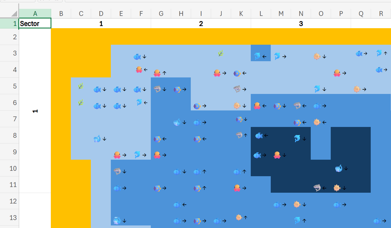 După ce descărcați fișierul de la adresa de mai sus, veți observa că sunt 3 foi de calcul: Case în care trebuie să răspundeți și unde aveți explicațiile detaliate, Answers în care sunt răspunsurile pentru fiecare nivel și harta Ocean care conține tabelul cu mărimea… teoretică a speciilor marine de pe hartă.