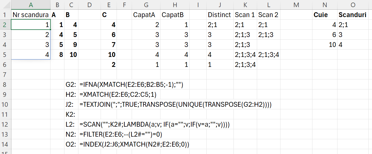 Ca să pot scana blocul de la poziția 0, apoi de la poziția 1 și așa mai departe, a trebuit să definesc secvența din B2 pe care o parcurg cu MAP(). Apoi pentru fiecare poziție, returnez o combinație de valori de pe blocul A2:A6 pe care-l parcurg cu SCAN(). Partea frumoasă a acestei construcții este dată de faptul că în acumulatorul a introduc întotdeauna valorile în ordinea lor, ceea ce-mi permite să le iau cu acel TAKE() pentru a-l putea compara cu valoarea curentă V ca să identific dacă valorile sunt egale. Scan-ul funcționează la început pentru valoarea 0 a vectorului din B2#. Apoi map-ul duce Scanul mai jos pentru restul de slices.