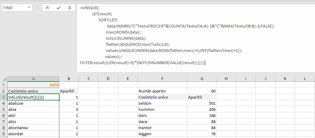 În celula G2: am introdus o valoare echivalentă numărului minim de apariții a unui cuvânt. Având în vedere că zona de cuvinte unice este formată dintr-un array dinamic și o coloană de calcul pe baza lui, nu putem sorta datele după numărul de apariții. În F3: am introdus funcția: