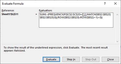 =SUM(–(FREQUENCY(IF($C$2:$C$20=F11;MATCH($B$2:$B$20;$B$2:$B$20;0));ROW($B$2:$B$20)-ROW($B$2)+1)>0))