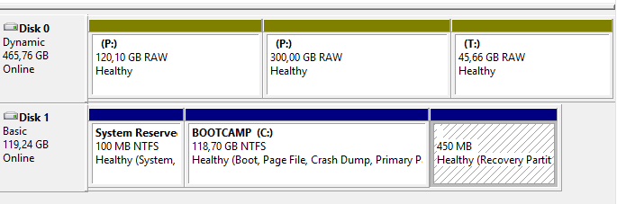 Așa că cel mai bine ar fi să recuperați datele cumva… de pe discurile care nu sunt accesibile, să ștergeți partițiile dinamice și discul se transformă ca prin minune în Basic pe care poți recrea partițiile clasice. Personal sunt un mare fan al File Scavenger, care, în viziunea mea, este cel mai bun tool de recovery de pe surse de memorie defuncte. Dar durează! Faza faină este că orice Windows, de la 8 încoace, când bootează de pe stik permite să faci repair la computer și de acolo poți folosi clasicele comenzi DOS pentru a recupera date. Suprinzător că în command prompt discurile logice (P și T din pozele anterioare) sunt accesibile iar comanda XCOPY poate copia întreaga structură de directoare pe un disc extern. Așa am reușit să-mi recuperez fișierele și să pot șterge în liniște minunatele partiții RAW.