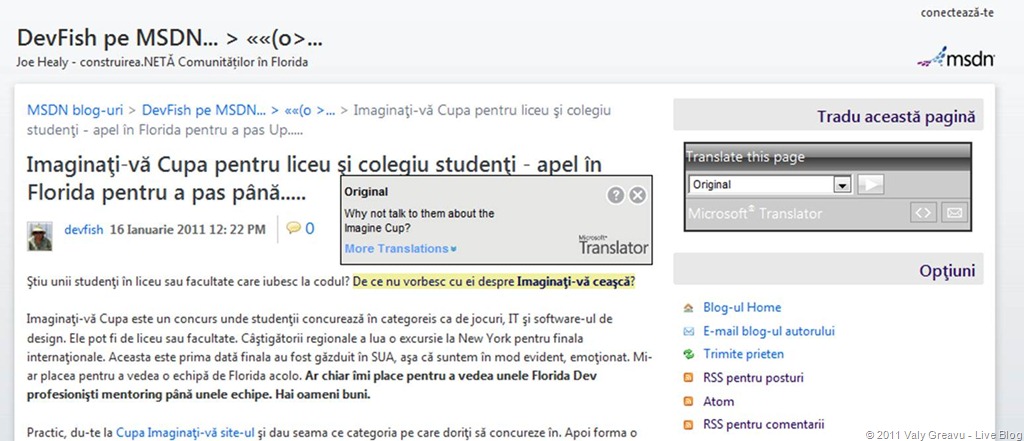 Google Translate recunoaște măcar că e vorba despre competiția Imagine Cup: ” Că unii elevi de liceu sau colegiu care iubesc la codul? De ce nu vorbesc cu ei despre Imagine Cup?