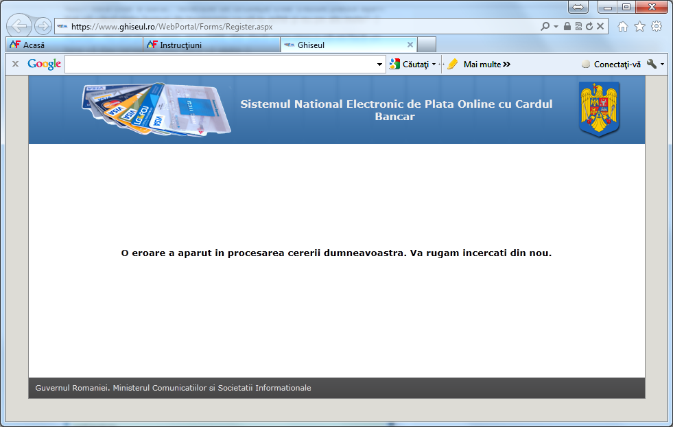 Complet independent de mine, având în vedere că nu aveam “lichizi” la mine, am întrebat în nesimţirea mea dacă nu cumva aş putea să plătesc cu cardu’. Foarte de treabă doamna de la Ghişeu mi-a spus că aş putea să plătesc chiar din fotoliul meu de acasă. Având în vedere că nu am fotoliu acasă, am întrebat dacă nu pot plăti de pe Internet. S-a iluminat la faţă şi mi-a spus: Ooo sigur că da, uitaţi aici avem chiar nişte instrucţiuni, pas cu pas foarte simple, şi mi-a înmânat un A4 listat de mai demult, gata de aplicat în practică.