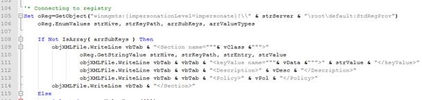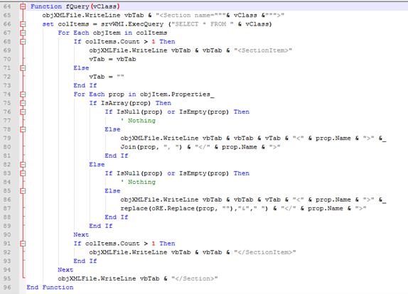Provocarea pentru noi în realizarea acestui script a fost de a interoga în mod dinamic WMI pe baza datelor dinamice de intrare. În atingerea acestui obiectiv am creat o funcție parametrizată (imagine) care generează secțiuni în fișierul de ieșire în funcție de valorile rezultate din interogările WMI.