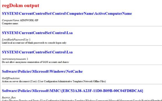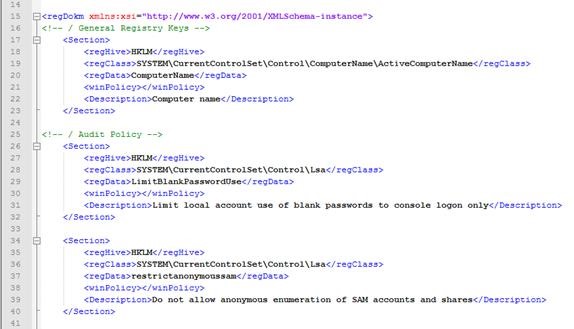 Elementul rădăcină este winDokm iar fiecare clasă de registry este prezentată în elementele repetitive Section. Pentru sistemele de operare de tip Windows 2008 Server și ulterioare există o clasă WMI specifică, Win32_ServerFeature, folosită pentru extragerea rolurilor curente configurate pe serverele respective.