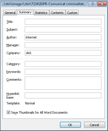 Deci, este un document realizat de autorul internet, pe un calculator al companiei click descărcabil de pe site-ul Poliției Române. Dincolo de bănuielile pe care le am, legate de un subiect de mai sus, cred că vorbim cu certitudine de un cumul de vicii de procedură informatică: (1) pe ”licența de utilizare” a soft-ului sunt convins că nu scria internet și nici click și (2) autorul documentului trebuia să șteargă metadatele înainte de publicarea documentului, sau trebuia să-l publice într-un format general recunoscut și acceptat de toți utilizatorii de calculatoare din România (HTML sau PDF de exemplu).