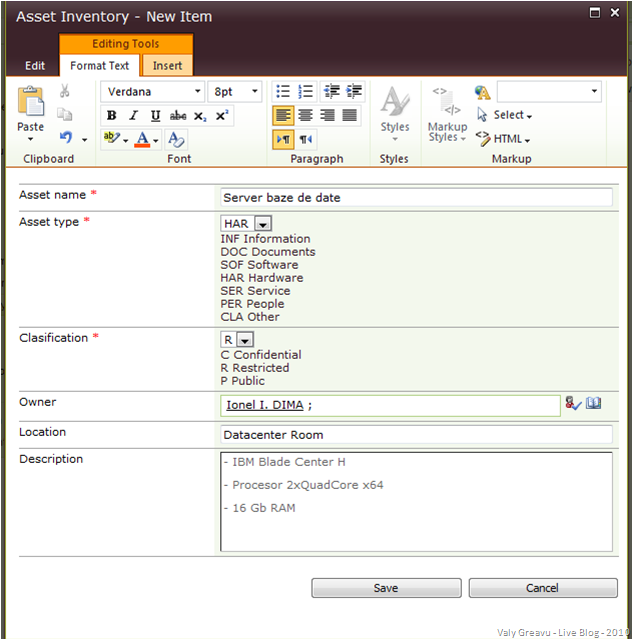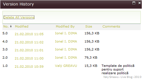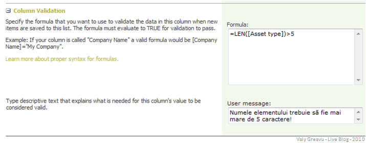 Foarte interesantă este funcția de versionare în 2010. De exemplu, dacă unui activ de tip server îi schimbăm memoria sau alte caracteristici tehnice, la actualizarea listei se păstrează și versiunea anterioară. Trebuie să știți că versionarea nu este activată implicit și putem stabili numărul maxim de versiuni. Nu trebuie să omitem prezența funcțiilor de validate a datelor introduse pentru a elimina inadvertențele sau greșelile: