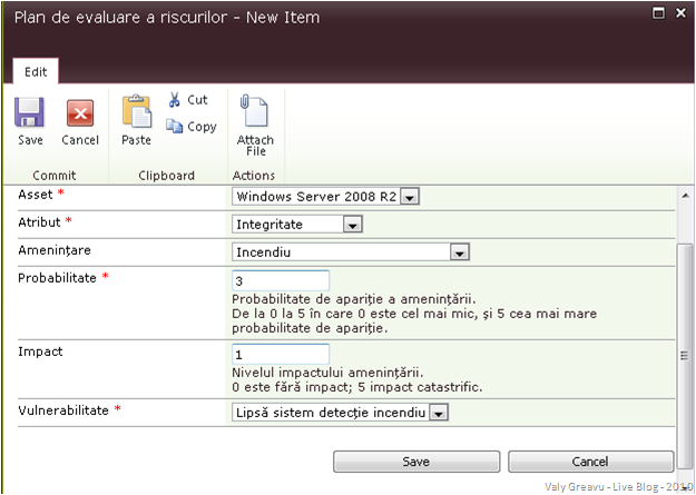 Modelul prezentat în figură este implementat într-o listă personalizată SharePoint care preia amenințările și vulnerabilitățile din alte două liste specifice. Sunt multe metodologii de evaluare a riscurilor (sau mai multe detalii aici), dar prin articolul curent am încercat să exemplificăm tehnica utilizată de aplicația vsRISK care după o serie de articole este menționat ca cel mai complet produs software pentru analiza de riscuri pentru implementarea și gestionarea ISO 27001.