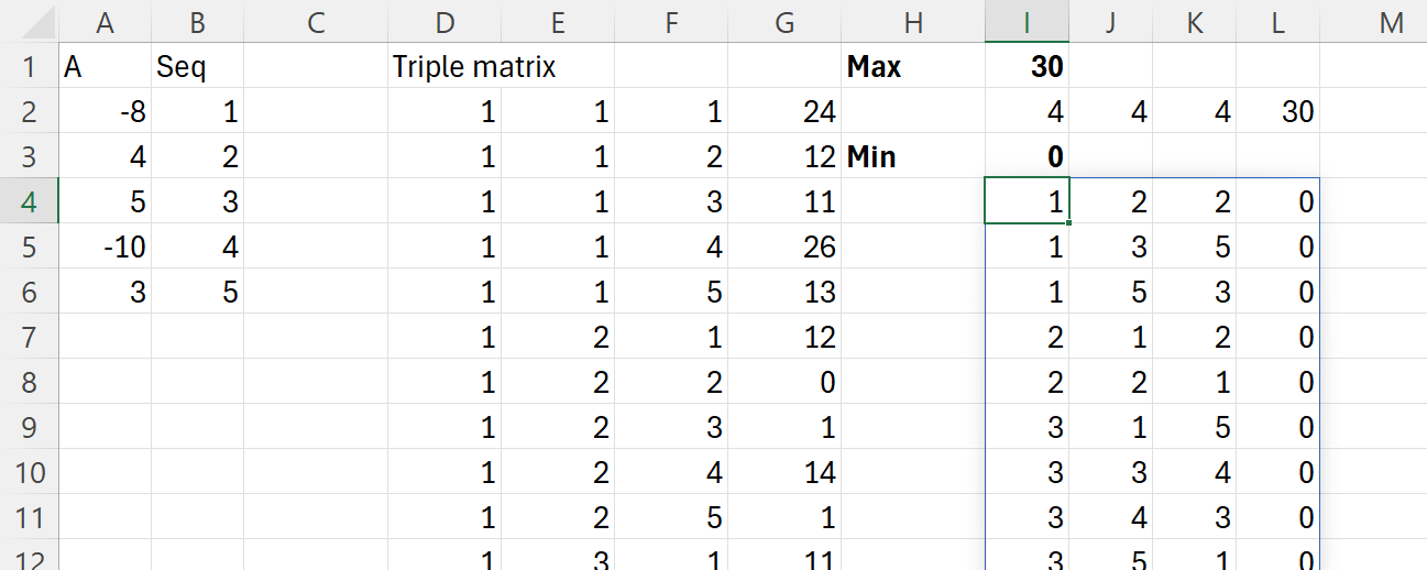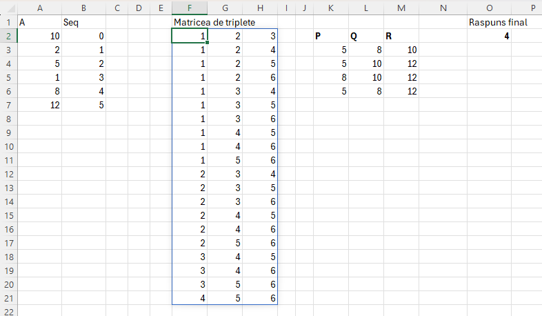 Ca să putem compara oricare 3 elemente dintr-un vector avem nevoie de matricea de triplete introdusă în articolul Modele de algoritmi in #Excel – Sorting (6). De asemenea, problema triunghiurilor a mai fost tratată în articolul menționat la Problema Triangle. De asemenea, a fost descrisă puțin mai pe larg în articolul Programarea funcțională în Excel Modern din pinmagazine.ro una din ultimele reviste de IT, pe care le cunosc eu, disponibilă și offline.