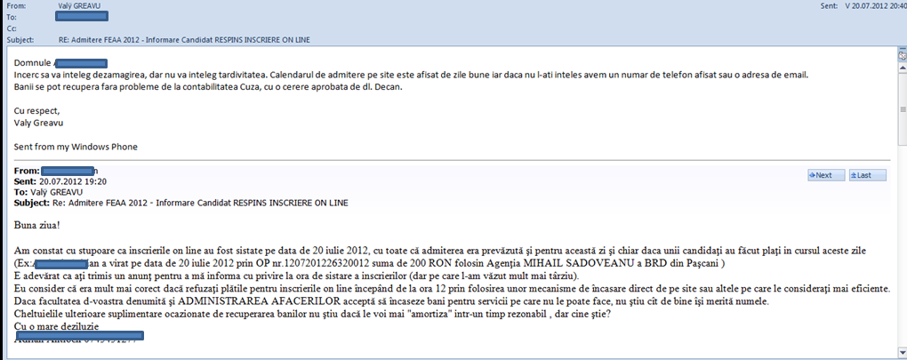 Având în vedere faptul că permanent am interacționat cu candidații prin e-mail, telefonic, on-line, și cum nu toate merg întocmai ca la carte, am avut și neplăceri în colaborarea cu candidații, unul dintre cele mai negre feedback-uri venind pe linia e-mail-ui: