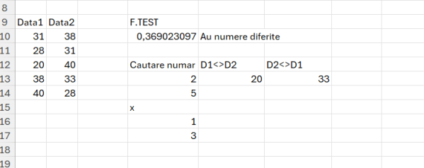 Pentru a compara valorile de pe cele două coloane fără a le sorta și alte operațiuni utilizăm în D2 funcția F.TEST() în cazul nostru cu sintaxa: =F.TEST(A2:A6;B2:B6)