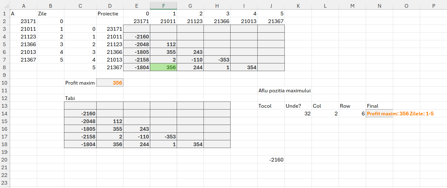 Ulterior în D10 facem un max din acel tabel și avem rezultatul final. Ca să obținem și zilele în care avem acele valori în cazul nostru 1 și 5, atunci trebuie să apelăm șa tehnica de identificare a unei valori într-un tabel, descrisă în articolul: Modele de algoritmi in #Excel– Prefix Sums (5.1)