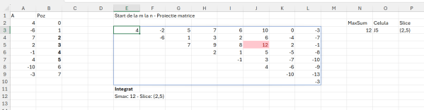 Din păcate pentru multe numere în A, Excelul începe să gâfâie. La 1024 de numere algormitmul merge foarte bine dar la 4096 a început deja să dea semne de blocare. Pentru testare am utilizat funcția de generare array aleatoriu: =RANDARRAY(128;1;-50; 200;TRUE) în care se generează 128 de numere întrgi (TRUE) de la minim -50 până la maximum 200. Limita de numere din A este limita numărului de coloane din Excel (16384) pentru a putea opera matricea de calcule.