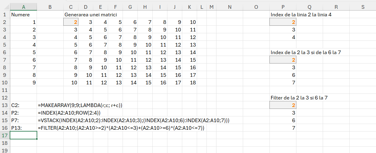 După cum se observă în C2 este generată o matrice cu 9 linii și nouă coloane, pentru fiecare celulă realizându-se calculul r+c, însemnând valoarea rândului cu valoarea coloanei.