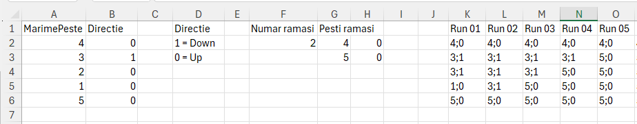 Ca să pot rezolva această problemă mi-am dat seama după mult timp că cea mai bună abordare este cu SCAN și căutări permanente și comparare cu valoarea anterioară sau valoarea următoare în funcție de direcția în care se mișcă peștele. Ca să ajung la funcția din G2, am trecut prin mai multe variante, una intermediară este acea a rulărilor care încep cu coloana K în care input pentru Run 01 este o concatenare a tabelului, iar pentru Run 02 încolo este rezultatul anterior. Aici a fost de fapt cheia: cum folosești un tabel ca un input recursiv?!