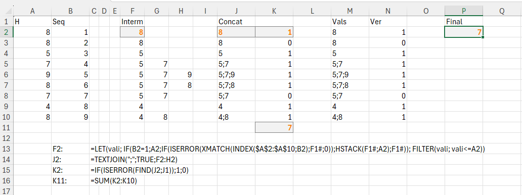 În prima parte (formulele afișate) am setat modelul problemei care la bază folosește un filtru dinamic pe poziția curentă (valoarea din B2) din vectorul H. Funcția din F2 este copiată apoi în jos. Vali este de fapt valoarea rezultată anterior, ceea ce ne duce cu gândul la o rezolvare integrată la acumulatorul dintr-un scan.