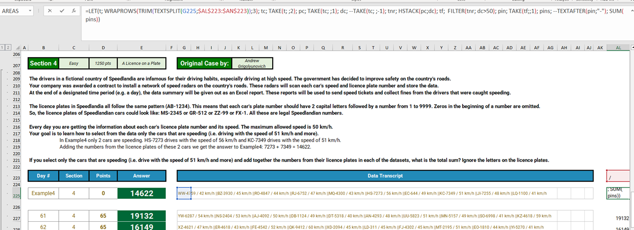 La una din probleme am reușit să o rezolv dintr-o singură funcție, exact în stilul celor pe care-i urmăresc pe diferite canale. În funcție parsez textul pas cu pas și-l transfer între tabele intermediare totul într-o sigură formulă.